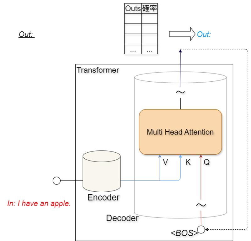 例えば、Encoderに「I have an apple」という文章を入力します。Encoderによって数値化されたデータはDecoder 内のMulti Head Attention機構のQueryとKeyとして付加されます。Decoderは付加された情報をDecoderの入力とともに処理し、<BOS>の次に来る単語を確率的に求め、最も確率の高い単語を出力します。