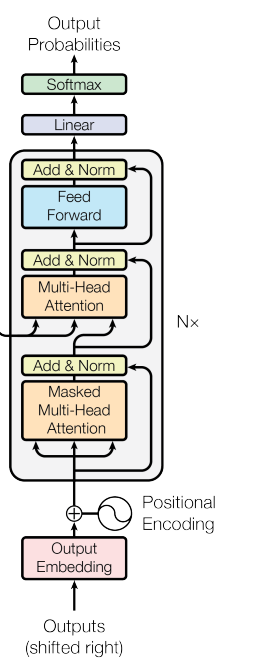 Masked Multi Head Attention層では未来の情報の要素を-∞と表記する(マスクする)ことで、未来の情報の要素を参照させない操作を行っています。 マスクを行うと、まだ生成されていない要素を情報量がない要素として扱うことが出来ます。 この操作も別の記事で詳しく解説します。