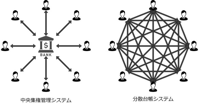 日本円などの一般的な通貨は、銀行といった第三者機関が個人間の取引内容を記録し、信頼性を担保しています。それに対し、分散台帳システムはネットワークに属する全てのユーザが全ての取引内容を記録していきます。