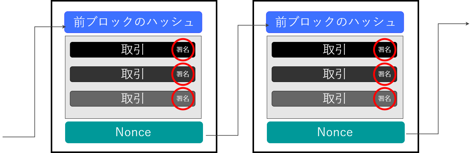 前ブロックのハッシュには前のブロックのNonce値から計算されたハッシュ値が格納されており、ブロックのチェーンを構成しています。